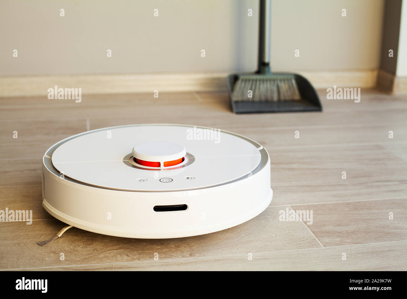Smart Home Robot Vacuum Cleaner Performs Automatic Cleaning Of The Apartment At A Certain Time Stock Photo Alamy
